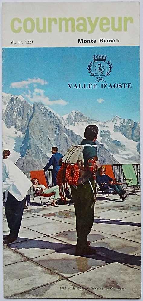 Pieghevole di 12 facciate di cm. 24 x 11 con due panorami a volo d'uccello di Oberbacher (estivo e invernale), ciascuno su tre facciate e numerose illustrazioni fotografiche a colori. Copertina fotografica. (Cameriere in giacca bianca e papillon che serve turisti sulla terrazza dell'Arp, con Monte Bianco sullo sfondo!). VG. ** Testo in francese.
