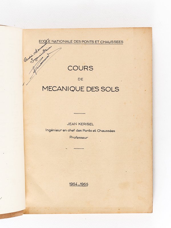 1 vol. in-4 br., Ecole Nationale des Ponts et Chaussées. 1954-1955, 376 pp. Bon état (passages soulignés). Jean Kérisel (1908-2005), Ingénieur général des Ponts et Chaussées, expert internationalement reconnu en mécanique des sols, il fut un important contributeur aux progrès de la géotechnique. Il intervint notamment sur la construction d'ouvrages tels que le tunnel de Fourvière à Lyon, les travaux du RER à Paris, les fondations du pont Houphouët Boigny d'Abidjan.