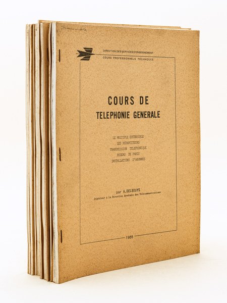 16 brochure agrafées, Postes et Télécommunications ; Direction des Services d'Enseignement ; Cours Professionnels Techniques, 1966 (I), 1970-1971, [ 67-264 pp. non suivies) ; 24 ; 37 ; 14 ; 15 ; 30 ; 67 ; 27 ; 80 ; 120 ; 33 ; 39 ; 24 ; 25 ; 23 ; 67 pp. Rappel du titre complet : Cours de Téléphonie Générale (16 Volumes) [ I ] Le multiple extensible. Les répartiteurs. Transmission téléphonique. Réseau de Paris. Installations d'Abonnés ; Chapitre II : Le standard à batterie locale ; Chapitre III : Le Relais téléphonique ; Chapitre IV : Le Commutateur multiple ; Chapitre V : La Batterie Centrale ; Chapitre VI : Le Multiple extensible ; Chapitre VII : Les Répartiteurs ; Chapitre VIII : Le trafic téléphonique ; Chapitre IX : Eléments de téléphonie automatique ; Chapitre X : Transmission téléphonique ; Chapitre XI : Le service universel. Organisation du réseau téléphonique. Plan de transmission. Plan d'acheminement ; Chapitre XII : Caractéristiques générales des Centres de Commutation. Conditions d'utilisation des circuits interurbains et locaux ; Chapitre XIII : L'établissement des communications téléphoniques ; Chapitre XIV : Le service téléphonique international ; Chapitre XV : Organisation du réseau téléphonique de la région parisienne ; Chapitre XVII : La signalisation Bon ensemble. Le premier fascicule indiqué, daté de 1966, n'a pas de mention de classement en couverture, le chapitre XVI manque. Ce rare ensemble est une importante source de renseignement sur les réseaux téléphoniques des années 1960-1970