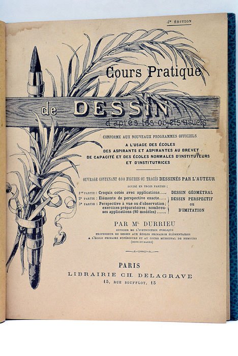 Cours Pratique de Dessin d'après les objets usuels. Conforme aux nouveaux programmes officiels. À l'usage des écoles, des aspirants et aspirantes au brevet de capacité des écoles normales d'instituteurs et d'institutrices. Ouvrage contenant 600 figures ou tracés dessinés par l'auteur. Divisé en trois parties : 1ere partie : Croquis cotés avec applications. 2e partie : Éléments de perspective exacte. 3e partie : Perspective à vue ou d'observation; exercices préparatoires; nombreuses applications (80 modèles). Dessin géométrical, dessin perspectif ou d'imitation.