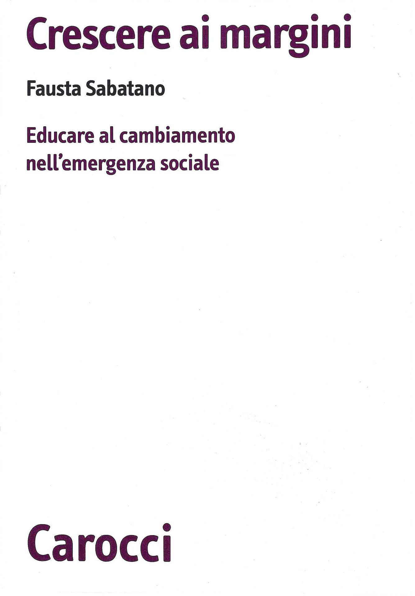 <p><span style="font-size:14pt;"><span style="font-size:14pt;"><span style="font-size:14pt;"><span style="font-size:14pt;"><span style="font-size:14pt;">Sabatano Fausta, Crescere ai margini. Educare al cambiamento nell'emergenza sociale</span></span></span></span></span><span style="font-size:14pt;"><span style="font-size:14pt;"><span style="font-size:14pt;"><span style="font-size:14pt;"><span style="font-size:14pt;">. Carocci 2014.</span></span></span></span></span></p>