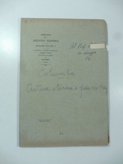 In 8 (cm 16 x 24), pagine numerate da 145 a 184. Pagine intonse. Brossura editoriale con mancanza al piatto anteriore in corrispondenza della dedica autografa. Estratto editoriale dall'Annuario della Biblioteca filosofica.