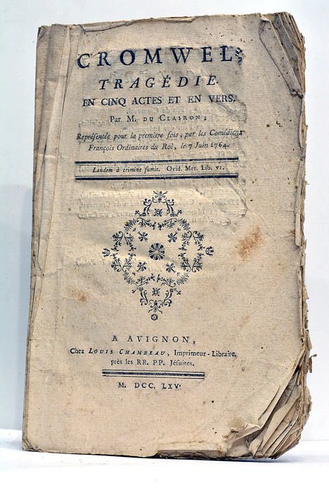 39 pages. (21x13 Cm). Broché. Plis et traces de plis. Accrocs et petites déchirures. Taches et rousseurs. Publiée en 1766 à Avignon par Louis Chambeau, cette tragédie en cinq actes et en vers de Maillet-Duclairon plonge dans la complexité politique et personnelle de Cromwell, figure emblématique de l'histoire britannique. L'œuvre, représentée pour la première fois deux ans auparavant, témoigne de l'intérêt de l'époque pour les grandes figures historiques qui ont marqué par leurs actions le cours de l'histoire. Maillet-Duclairon, connu pour ses talents de dramaturge mais aussi de négociant et traducteur, était en relation avec des figures intellectuelles majeures de son temps, telles que Voltaire, Turgot, et Malesherbes. Petit trou traversant une dizaine de pages touchant le numéros des pages. Plis et petits accrocs.