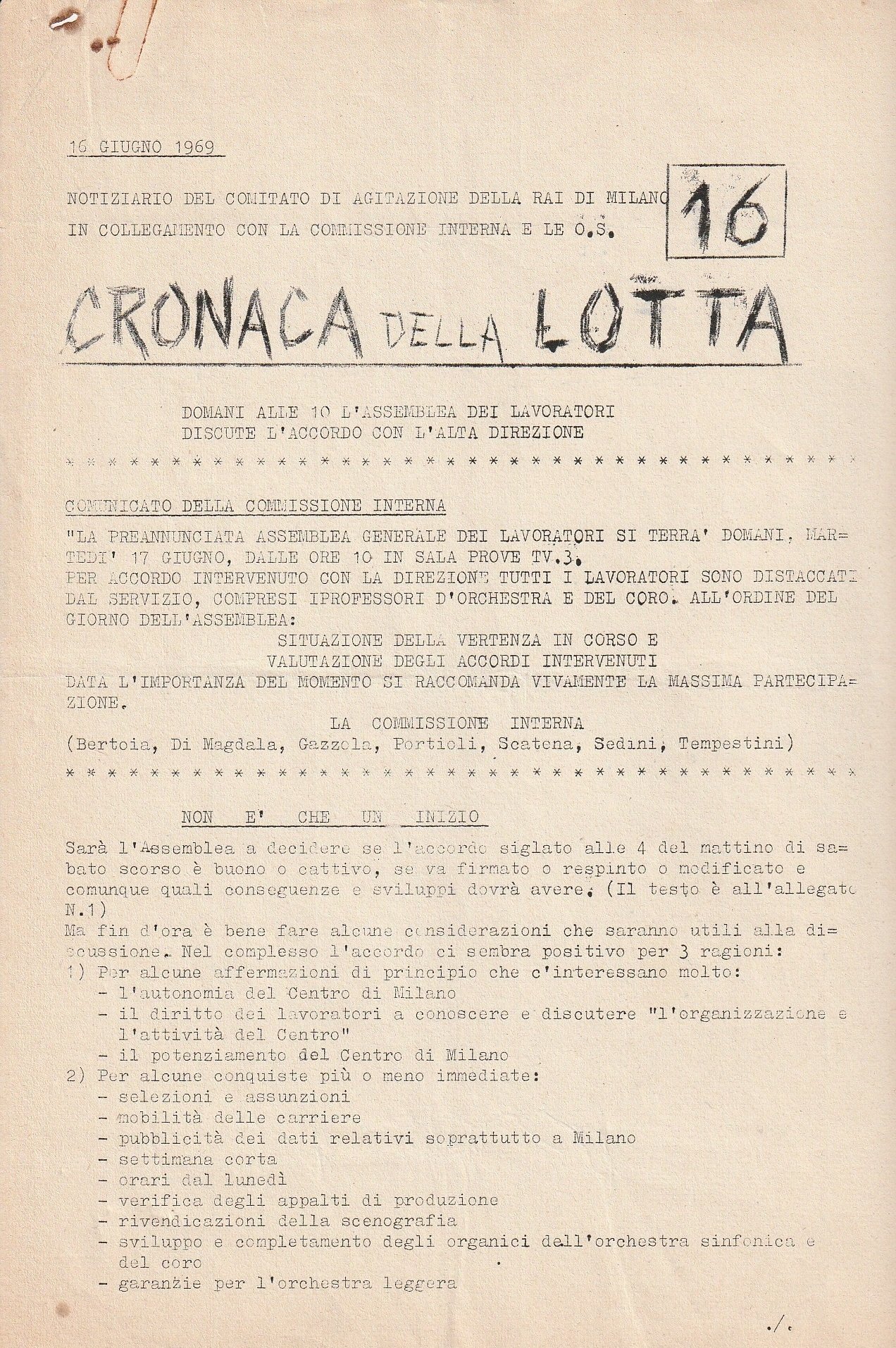 - Comitato Di Agitazione Della Rai Di Milano In Collegamento Con L, A Commissione Interna E Le O.S. (Organizzazioni Sindacali)