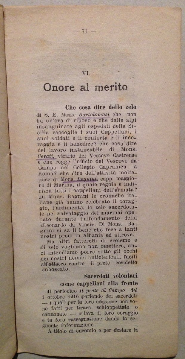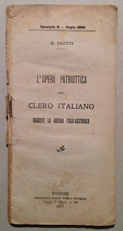 B. Crotti, L'opera patriotica del clero italiano durante la guerra italo-austriaca Tipografia Santa Maria Novella, Firenze, 1917; cm. 21x10,5; pp. 88; senza brossura editoriale, ma completo. Condizioni di conservazione Esemplare in discreto stato con tracce d'uso e del tempo; volume con bruniture; dorso fessurato con strappetti; interni buoni, qualche fascicolo leggermente allentato, minime sottolineature a matita colorata. Esemplare raro, completo. OPEB.5063 MT