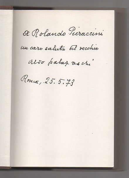 LIBROPrima edizione. Ottimo esemplare (minime brunitura al dorso della sovracoperta, minima brunitura perimetrale alle carte). Segno di etichetta staccata al risvolto posteriore della sovracoperta, assolutamente non deturpante.Raccolta di poesie scritte – in parte in italiano e in parte in francese - in età senile in cui pure, come scritto nelle note introduttive ai risvolti della sovracoperta, Palazzeschi rivela di aver ricevuto «la grazia suprema non solo di sentirsi giovane in tarda età, che può essere illusione, ma di essere salutato, dai giovani, giovane […]. La saggezza di Palazzeschi ha, in maniera impudente, l’incarnato, il colorito roseo dell’adolescenza. Neanche il cambiamento di lingua riesce ad appannare il tono che è suo e soltanto suo: un buon quinto di questo libro è in francese, e tuttavia il mutare di strumento espressivo non muta in niente i ritmi, e se si vuole, le ilari, incantevoli, precipitose aritmie, del “cuore” della poesia palazzeschiana».