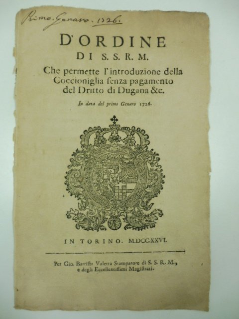 D'ordine di S. S. R. M. che permette l'introduzione della coccioniglia senza pagamento del diritto di dogana & C. In data del primo Genaro 1726