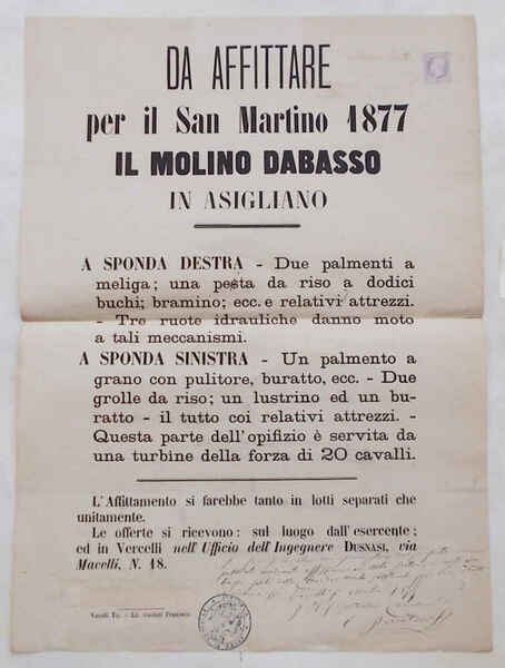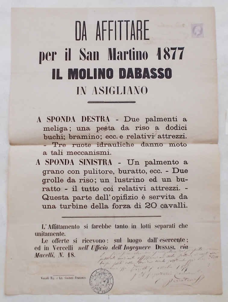 Da affittare per il San Martino 1877 il Molino Dabasso in Asigliano. A sponda destra - due palmenti a meliga; una pesta da riso a dodici buchi. A sponda sinistra - un palmento a grano con pulitore, buratto, ecc. Due grolle da riso. Questa parte dell'opificio è servita da una turbìne della forza di 20 cavalli. Le offerte si ricevono sul luogo dell'esercente e in Vercelli nell'ufficio dell'Ingegnere Dusnasi…