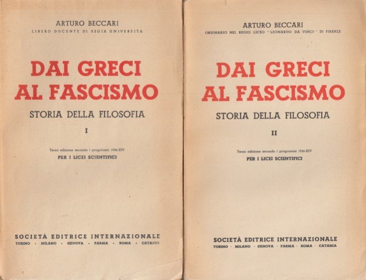 2 Voll. In-16 (Cm 19,8 x 12,5), pp. 223-235 , brossura editoriale. Terza edizione secondo i programmi 1936-XIV Per i licei Scientifici. Normali segni del tempo. MOLTO BUONO