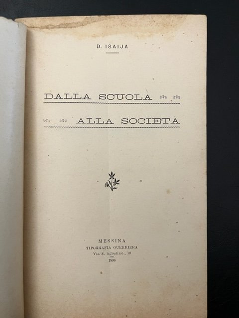 In 16 (cm 12,5 x 20), pp. 65 + (1 bianca) + (1) di errata + (1 bianca). Mancanza reintegrata al margine superiore del piatto anteriore. Lieve mancanza del lembo di carta superiore al primo foglio bianco e, ancora piu' piccola, al frontespizio. Brossura editoriale. Raccolta di saggi di Domenico Isaija comprendente: Delinquenza ed asili d'infanzia in cui l'A. si rivolgeva ad Antonio De Leo e plaudeva alla sua iniziativa di aprire un asilo a Bagnara Calabra; I tipi mentali e l'educazione della scuola; La prima sconfitta! Al carissimo educatore della mia adolescenza Giuseppe Minasi; Lo Stato e la tutela dell'infanzia nelle leggi americane. Domenico Isaija nacque a Bagnara Calabra e si interesso' ai tempi dell'educazione scolastica popolare. Fu anche autore di compendi di storia per la scuola annunciati come di imminente uscita al piatto posteriore della copertina di questa pubblicazione.