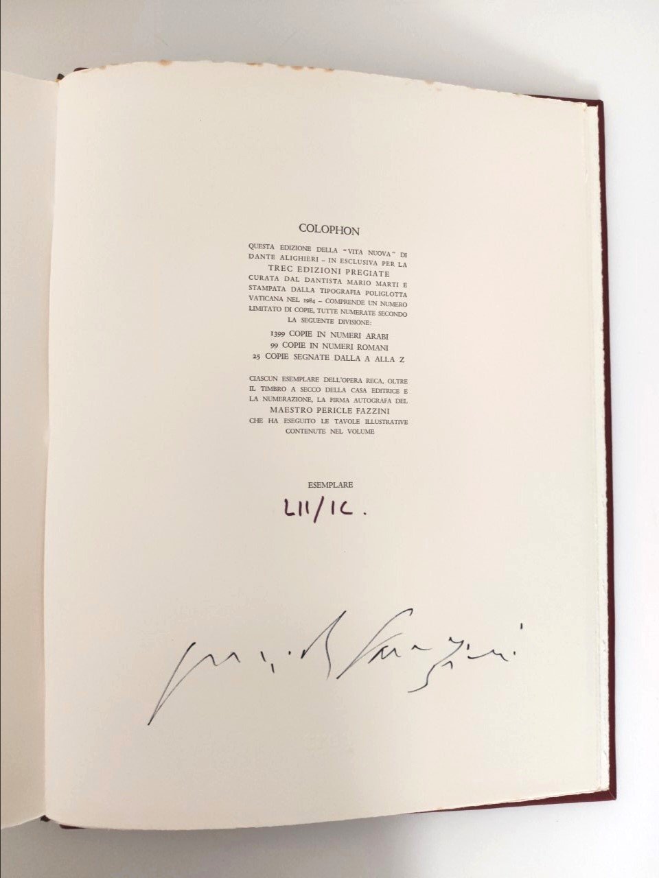 a cura di Mario Marti e stampata dalla tipografia poliglotta vaticana nel 1984 comprende un numero limitato di copie e tutto numerate secondo la seguente suddivisione 1399 con numeri arabi 99 copie con numeri romani 25 copie segnate dalla A alla Z ciascuna esemplare dell'Opera reca oltre un timbro a secco della casa editrice e la numerazione la firma autografa del maestro Pericle Fazzini che ha eseguito le tavole illustrative contenute nel volume