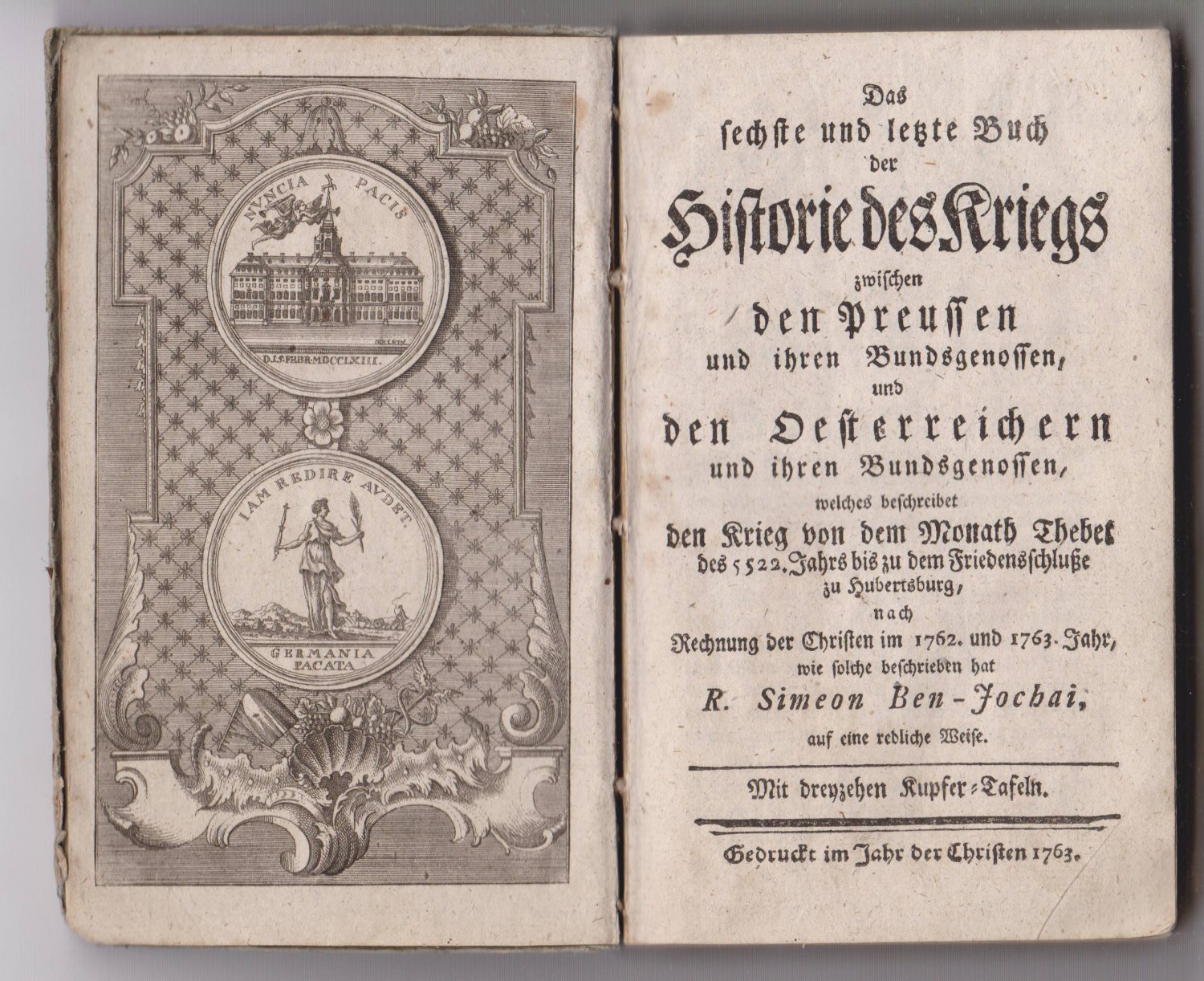 RAR! - Mit 13 ganzseitigen Kupfer-Tafeln, eine davon als Frontispiz mit Abbildung von Friedensfeiermedaillen. Die weiteren zeigen Abbildungen: Prospect des Fort Royal auf der Insel Martinique.- Prospect der Stadt Merseburg.- Prospect der Action bey Döbeln den 12. May a 1762. - Action an der Fulda d. 23. Jul. 1762. - Action bey Friedberg d. 30. August. 1762. - Canonade bey der Brückenmühle bey Amöneburg den 21. Sept. A. 1762. - Prospect der Stadt Havana der Haupt Stadt auf der Insel Cuba. - Attaque der Postirung bey Leutmansdorf. d. 21.Jul. A. 1762. - Bataille bey Reichenbach d. 16. Augst. A. 1762. - Prospect der Affaire bey Freyberg den Oct. A. 1762. - Bataille bey Freyberg d. 29. Oct. A. 1762.- Belagerung der Stadt Almeida und Eroberung derselben d. 15. Augst. 1762. - Im Anhang das Definitiv-Friedens-Tractat vom 15. Februar 1763.