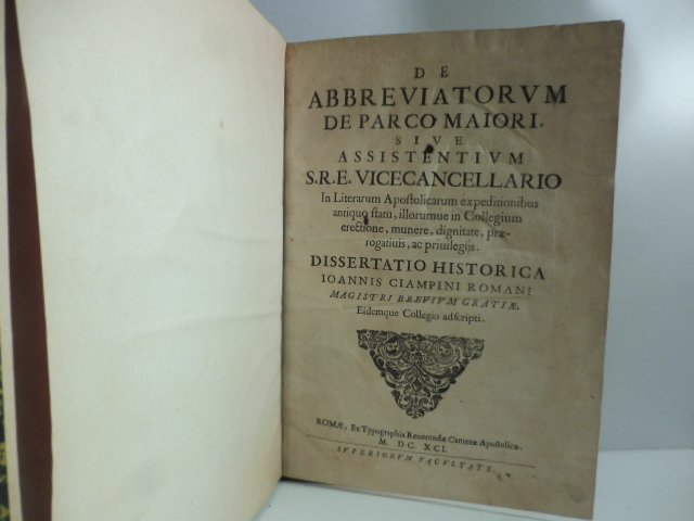 In 4, cm 23 x 32, pp. (6) + 4 + (2) + 124 + (12) + (L) + (14) con 2 tavole fuori testo incise all'acquaforte di cui 1 incisa piu' volte ripiegata. Legatura ottocentesca in mezza pergamena. Antichi rinforzi ai margini interni di alcune pagine. Edizione originale, rara, di quest'opera in cui si descrivono l'origine e la struttura dell'ufficio papale in cui si redigevano le brevi, cioe' una scrittura pontificia per affari di poca importanza che non portava bolla appesa ma solo il sigillo con anello del pescatore. Ciampini fu a capo di esso durante il pontificato di Innocenzo XII e nell'opera realizza una trattazione che parte dalla origine della denominazione dell'ufficio per soffermarsi poi sulla istituzione, evoluzione ecc. Jamme, Poncet, Offices et papaute., p. 160. Brunet, II, 3.