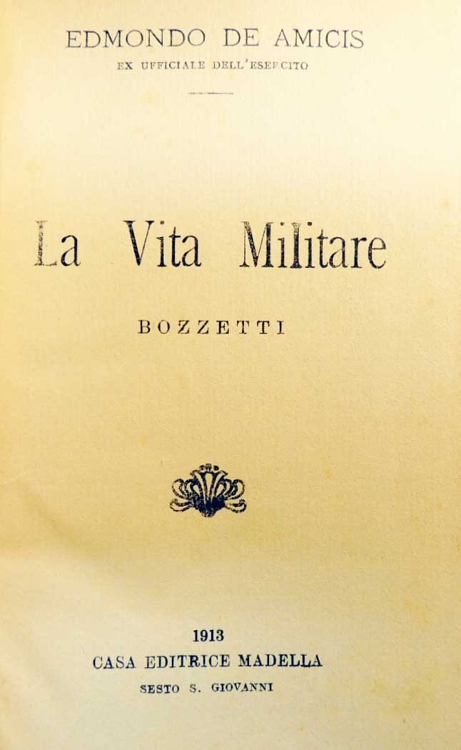 Edmondo De Amicis, La vita militare. Bozzetti, Casa Editrice Madella, Sesto S. Giovanni (Milano) 1913, pp. 314, cm 19, legatura in mezza tela con titoli in oro al dorso. Etichetta di collocazione al dorso, tracce d’uso al margine del frontespizio, pagine un po’ ingiallite, per il resto ben conservato.