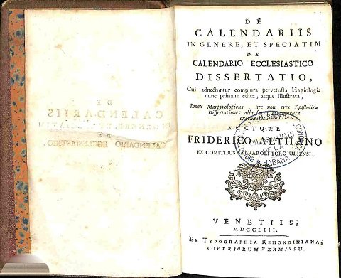 In 16 (cm 10,5 x 17,5), pp. XV + (1) + 456 con 1 tavola fuori testo piu' volte ripiegata. Timbro al frontespizio e a pagina VIII. Forellini di tarlo al margine inferiore bianco delle ultime 60 pagine circa. Legatura ottocentesca in mezza pelle con piatti in tela (qualche abrasione ai piatti). Importante studio del conte Federico Altan sul calendario laico ed ecclesiastico. All'uscita dell'opera si lega anche un episodio legato alla dedicatoria del libro al Papa: "era gia' stata autorizzata la dedica a Benedetto XIV e l'autore proponeva a Giambattista Remondini 'l'impressione', ma l'editore, nonostante il personale contributo finanziario dell'Altan, tardava a far uscire il libro e questi ne era preoccupato anche in considerazione della "vita pericolante" del papa, vale a dire dell'eventualita' di perdere il frutto della dedica" (Rara volumina, Pacini, 1996, p. 79). Cfr. Riccardi, "Biblioteca matematica italiana. Appendice parte I", p. 83.