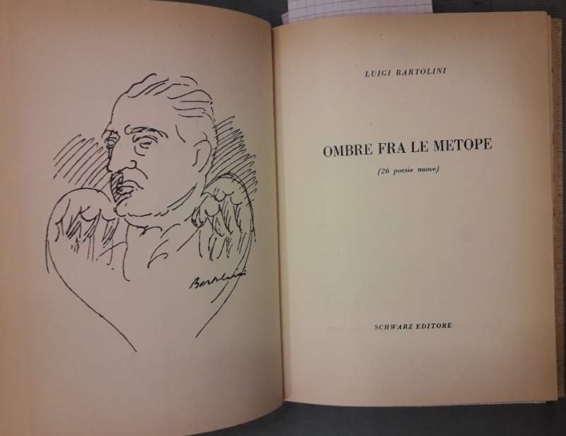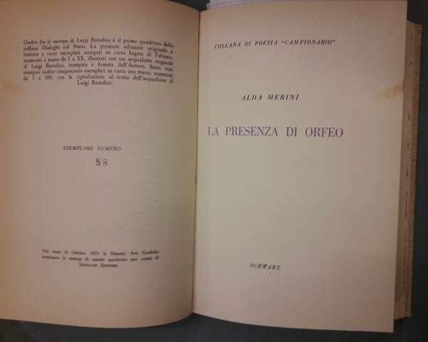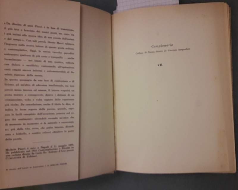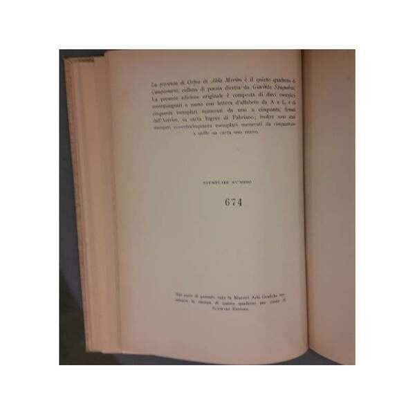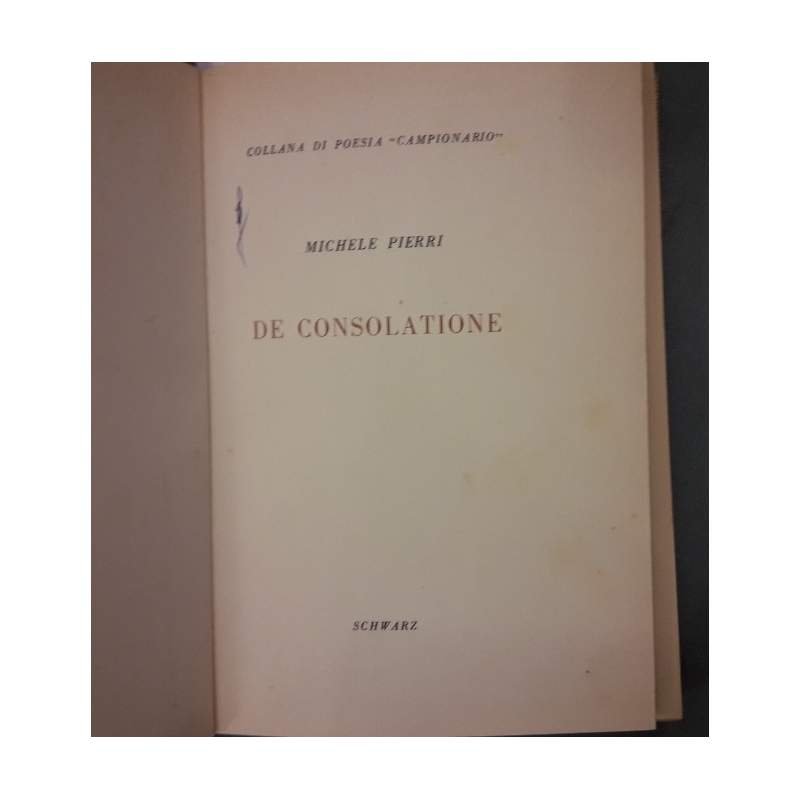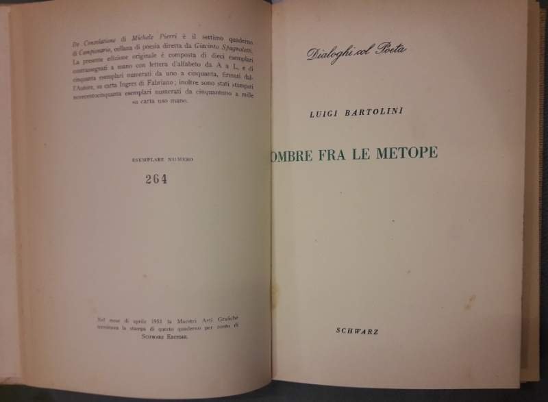 7 volumi uniti in unica legatura in tela con tasssello e tit. al dorso; Esemplari tutti numerati appartenenti alle collane "Campionario" e "Dialoghi col Poeta", piatti anteriori con risvolti mantenuti, tranne che per Carrieri, ritratti in antiporta. DE CONSOLATIONE (1946-1952), Michele Pierri, Campionario VII, es. 264/950, pp. 30 OMBRE FRA LE METOPE, Luigi Bartolini, Dialoghi col Poeta -I, es. 88/500, pp. 30 LA PRESENZA DI ORFEO, Alda Merini, Campionario V, es. 674/950, pp.31 L'INCERTEZZA AMOROSA, Alessandro Parronchi, Campionario, es. 743/950, pp.33 IL PONTE NELLA PIANURA, Carlo Bertocchi, Campionario IV, es. 74/950, pp. 35 A MIO PADRE, D'ESTATE, Giacinto Spagnoletti, Campionario VI, es. 944/950, pp. 40 IL CIGNO LANCIERE-Raffaele Carrieri-Uno scritto di E.Emanuelli, Geroglifici di Campigli, Dialoghi col Poeta, es. 438/500, pp. 38 Sigla a penna al piatto de : De Consolatione, piccolo strappo al margine interno sup. a p.35 de: Un ponte nella pianura; complessivamente ben tenuto, lievi bruniture e segni del tempo, leggere fioriture sparse, legatura salda, minimi segni del tempo alla cop. ***Due to bureaucratic reasons, books dated over 70 years old cannot be immediately exported, please contact us before placing the order.***