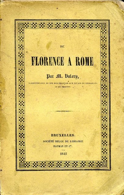 In-16°, pp. 226, brossura editoriale gialla con titolo entro bordura ornata. Buon esemplare in barbe. Unica edizione, rara, di questa guida della Toscana, del Lazio e dell'Umbria ricca di notazioni storico-artistiche. Il Valery (Parigi, 1789-ivi, 1847) fu conservatore delle biblioteche reali di Carlo V di Borbone (1824-1830) e di Luigi Filippo di Borbone Orléans (1830-1848) a Versailles e al Palais de Trianon. Manca a Fossati Bellani.