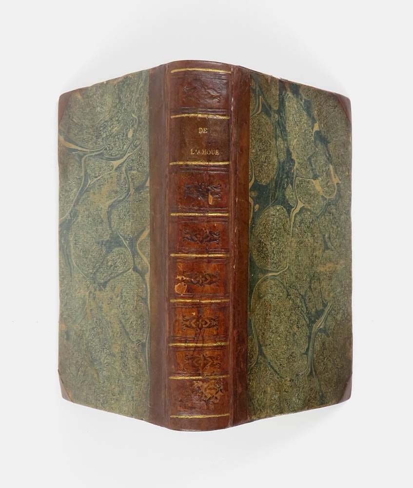 LIBROEdizione originale.Ottimo esemplare in gradevole legatura strettamente coeva (piccolissime mancanze al dorso e perimetrali); le carte misurano 165 x 97 mm.Prima opera letteraria di Stendhal, apparsa dopo la serie delle monografie pubblicate tra 1814 e 1817, grazie alle quali l’autore — non ancora Stendhal — s’era guadagnato qualche soldo, poca fama e alcune polemiche. L’opera, tirata in soli 150 esemplari non dichiarati, è di leggendaria rarità. In uno scritto poco noto, appena riproposto in cauda all’edizione francese di «Adorabile Stendhal» (Parigi 2020, a cura di Domenico Scarpa), lo ricordava, alla sua maniera, uno stendhaliano DOC come Leonardo Sciascia: « Chi frequenta l’antiquariato librario, e particolarmente chi ricerca le prime edizioni stendhaliane, sa che uno dei libri più introvabili, e quindi di più alto prezzo quando lo si trova, è il «De l’amour», pubblicato da Stendhal a Parigi nel 1822. E questa difficoltà a trovarlo, che diventa difficoltà ad averlo quando non si è assistiti da una condizione che permetta dispendio, pare sia da ascrivere al successo che, grazie al titolo, questo libro di Stendhal ebbe presso un pubblico non dedito all’acquisto di libri, e prevalentemente femminile, che approssimativamente possiamo assomigliare a quel più vasto pubblico che oggi consuma, di ritorno, come tra le due guerre, letteratura “rosa” e in più, e più massicciamente, programmi televisivi di uguale estrazione. Un pubblico, insomma, non abituato a conservare libri e nelle cui case non c’è posto per una libreria: ma decisiva sarà stata, alla non conservazione del libro di Stendhal, la delusione per come era scritto: come da un medico che si fosse inoculato un virus e ne annotasse minuziosamente, con ansietà e con freddezza insieme, di momento in momento, gli effetti, i sintomi, i progressi» (Sciascia, De l’amour, in: Alfabeta 69, feb. 1985, pp. 13-14). In realtà, il libro vendette assai poco; due anni dopo l’edizione, il libraio Monge lamentava di non averne vendute nemmeno quaranta, di copie. La maggior parte della pur già esigua tiratura fu rimessa in commercio nel 1933, in una seconda emissione interpolata con il frontespizio del nuovo editore, Bohaire. -- «E perciò questo libro di Stendhal resta come la cosa più “scientifica”, e al tempo stesso come la più appassionata, la più febbrile, la più lirica, che mai sia stata scritta sull’amore. Tutto quello che dopo Stendhal è stato scritto a descrivere e a definire l’amore, in effetti altro non è stato che uno scrivere sul “De l’amour”; sicché [.] possiamo dire che tutto quel che in un secolo e mezzo, fino a noi, è stato scritto sull’amore, non è che un’annotazione in margine a Stendhal» (Leonardo Sciascia).Bibl. Carteret, Le Trésor du bibliophile, vol. II, p. 346; Catalogo del fondo Stendhal Primoli, n. 2.2