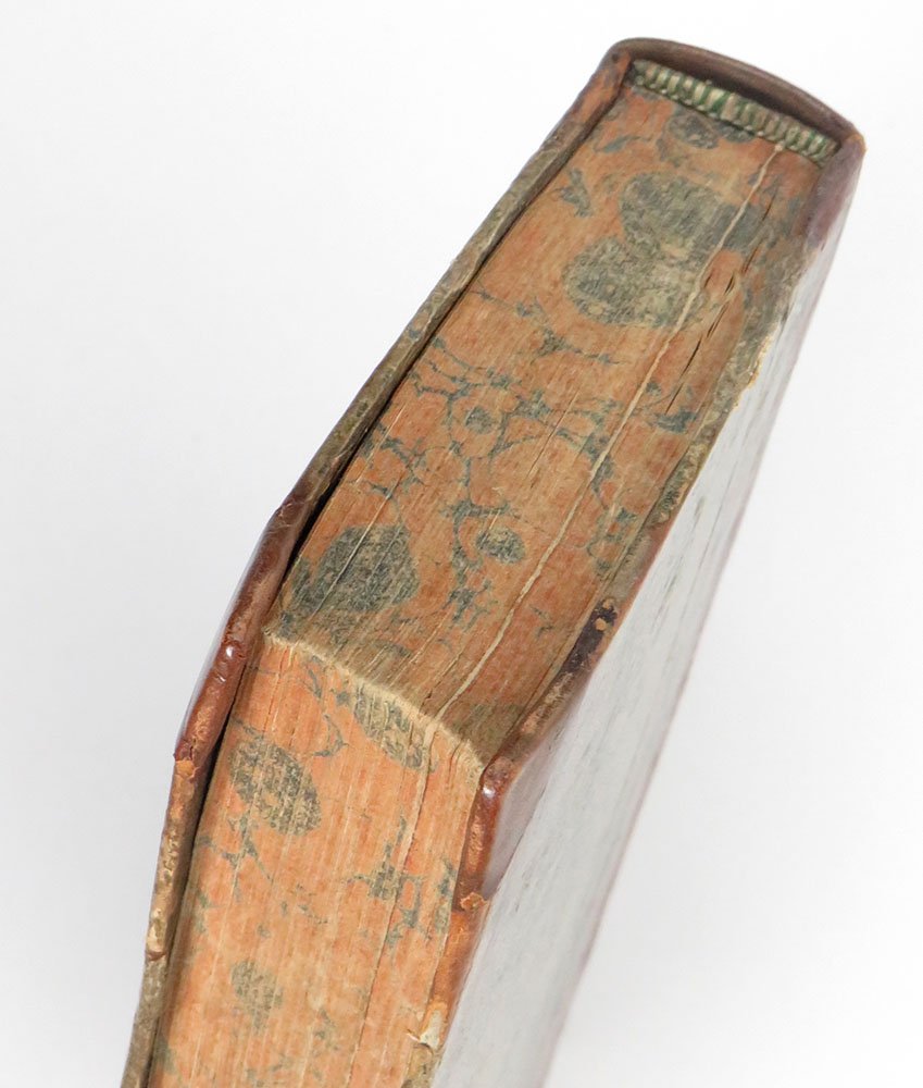 - legatura coeva in mezza pelle marrone con angolini; nove filetti oro al dorso, titolo in oro al secondo quadrante, fioroni impressi a secco negli altri; piatti in carta marmorizzata; risguardi in carta marmorizzata; tagli marmorizzati; cuffie in seta bianco-azzurra;