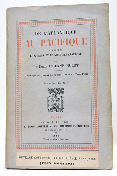 1 feuillet blanc. 3 feuillets. 339 pages. 2 cartes dépliantes hors-texte. (18,5x12 Cm). Broché. Couverture imprimée. Dos un peu fendillé. Récit de cette traversée du continent Nord-Américain, de Québec à l'Oregon. L'ouvrage comprend notamment un croquis du Parc National de Yellowstone ainsi qu'une grande carte dépliante de l'itinéraire emprunté par l'auteur. Exemplaire en bon état.