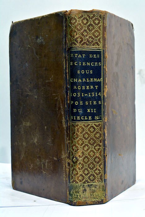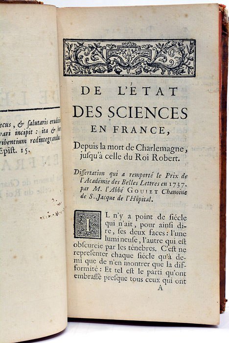 De l'Etat des Sciences dans l'étendue de la Monarchie Françoise sous Charlemagne. Paris, Guérin, 1734. (Reliés à la suite :) 2). GOUJET (Claude Pierre). De l'Etat des Sciences en France depuis la mort de Charlemagne, jusqu'à celle du Roi Robert. S.l.n.d. (Paris, 1737). 3). LE BOEUF (Jean). L'Etat des Sciences en France depuis la mort du Roy Robert arrivée en 1031 jusqu'à celle de Philippe le Bel, arrivée en 1314. Paris, Lambert et Durand, 1741. 4). LE BŒUF (Jean). Mémoire sur les anciennes représentations théâtrales pieuses, où le mélange de la fiction a quelquesfois obscurci la fond de la vérité. (1756). 5). Extraits de quelques Poésies du XII. XIII. et XIV Siècle. Lausanne, chez François Grasset, 1759.