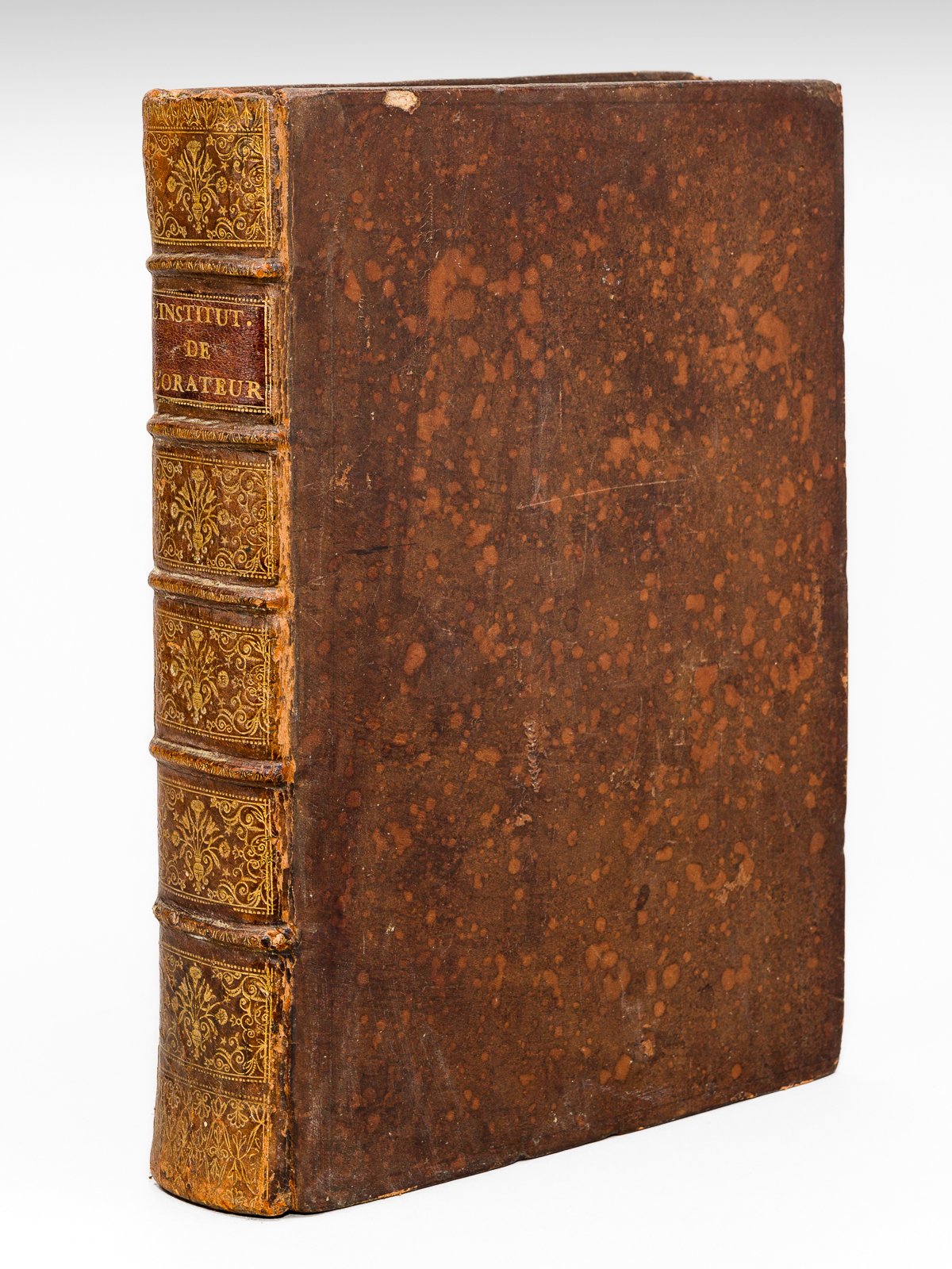 Traduit par M. l'Abbé Gedoyn, Chanoine de la Ste Chapelle de Paris, de l'Académie Royale des Inscriptions, & Belles Lettres, 1 vol. in-4 reliure de l'époque pleine basane marron, dos à 5 nerfs richement orné, Chez Grégoire Dupuis, Paris, 1718, 20 ff., 860 pp. et 6 ff. n. ch. Manuel de rhétorique, "l'Institution Oratoire" du pédagogue latin du premier siècle Quintilien connut un succès continu pendant plusieurs siècles. Le roi de Prusse Frédéric II écrivait de cette oeuvre : "Pour la rhétorique, qu'on s'en tienne à Quintilien. Quiconque, en l'étudiant, ne parvient pas à l'éloquence, n'y parviendra jamais". Exemplaire de la première édition de la traduction de l'abbé Gédoyn, provenant de la bibliothèque d'Alidor Delzant, avec son bel et grand ex-libris en garde (avec son anagramme "Alael Zaftt"). Secrétaire et exécuteur testamentaire des frères Goncourt, Alidor Delzant (1848-1905) fut également l'exécuteur testamentaire du grand critique et écrivain Paul de Saint-Victor. Bon état (piqûre de vers en marge haute n'affectant pas le texte, qq. petites usures en coupes et coiffe sup., bon exemplaire par ailleurs).