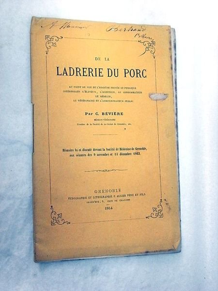 in-8. 1f. 25pp. Broché, couverture imprimée (légères traces d'usure). Feuillets légèrement écornés. Essai sur la peste des porcs par un vétérinaire de Grenoble. Envoi autographe signé de l'auteur.