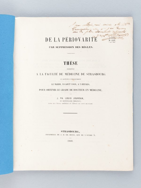 De la périovarite par suppression des règles [ Edition originale - Livre dédicacé par l'auteur ] Thèse présentée à la Faculté de Médecine de Strasbourg, soutenue publiquement le Mardi 18 Août 1868