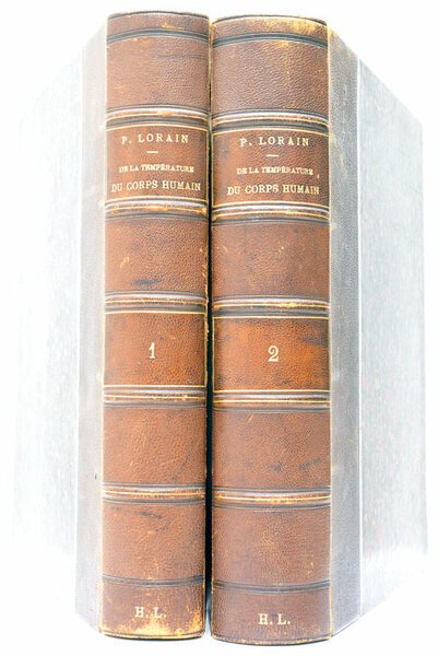 2 tomes en 2 volumes. 1 feuillet. Frontispice. XXIV. 611 pages. + 2 feuillets. 706 pages. 19 tableaux dépliants hors-texte. (24,5x 16 Cm). Demi-cuir. Dos à nerfs doré. Coins et coiffes émoussés. Charnières frottées. Rares rousseurs. Intèrieur en très bon état. Études de médecine clinique faites par P. J Lorain, médecin et historien de la médecine française. Les études décrits dans cet ouvrage sont faites avec l'aide de la méthode graphique et des appareils enregistreurs. Les nombreux tableaux dépliants illustrent les fréquences du pouls selon les différentes pathologies. Portrait gravé en frontispice. Exemplaire en excellent état.