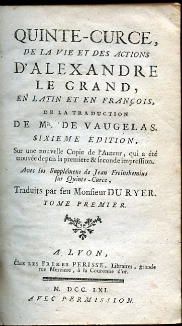 De la vie et des actions d'Alexandre le Grand, en Latin et en François, de la traduction de Mr. de Vaugelas. Sixième édition, sur une nouvelle Copie de l'Auteur, qui a été trouvée depuis la premiere & seconde impression.