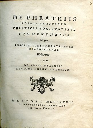 De Phratriis primis Graecorum politicis societatibus commentarius in qui inscriptiones phratriacae neapolitanae illustrantur item De Urbis Neapolis regione Herculanensium