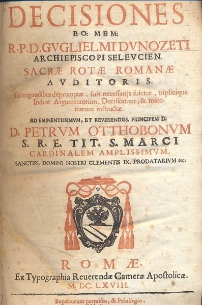 Decisiones Bo : Mem : R. P. D. Guglielmi Dunozeti Archiepiscopi Seleucien. Sacrae Rotae Romanae Auditoris. Ex originalibus depromptae, suis necessarijs sulcitate, triplicique Indice Argumentorum, Decisionum.