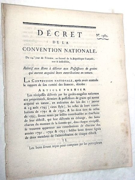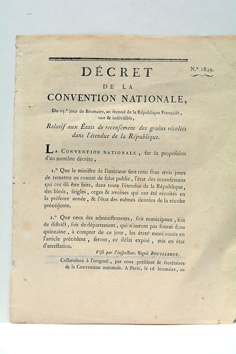 DÉCRET DE LA CONVENTION NATIONALE, du 15e jour de Brumaire, an second de la république Française, une et indivisible, relatif aux états de recensement des grains récoltés dans l'étendue de la République.