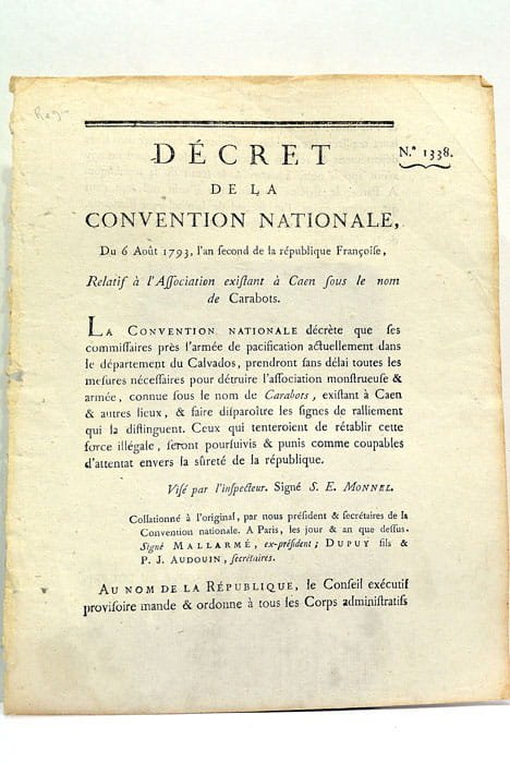 Décret de la Convention Nationale , Du 6 Août 1793, l'an second de la république Francaise. Relatif à l'Association existant à Caen sous le nom de Carabots.