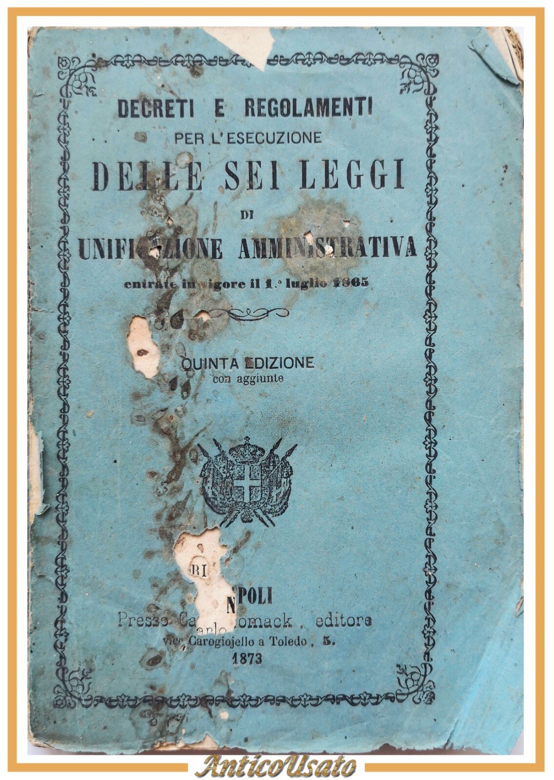 Napoli, Editore Carlo Zomack, 1873. 173 pagine. Copertina editoriale in brossura. Stato di conservazione: accettabile (manca il piatto posteriore e parte del dorso, piatto anteriore molto malridotto, fioriture, pieghe agli angoli) Libro usato saggistica