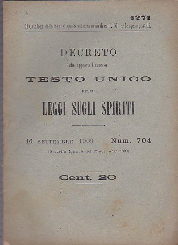 Decreto che approva l'annesso testo unico delle leggi sugli spiriti 16 settembre 1909 num. 704 (Gazzetta Ufficiale del 12 novembre 1909)