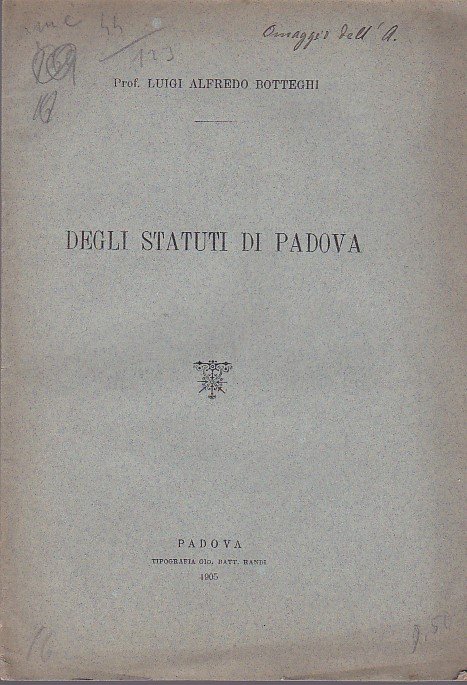 In-8°, pp. (2), 147-154, (2), brossura editoriale con dedica autografa dell'autore. Ottima copia. Memoria letta alla Regia Accademia di scienze, lettere ed arti in Padova nella tornata del giorno 19 marzo 1905 ed inserita nel vol. XXI, dispensa II degli 'Atti e Memorie'.