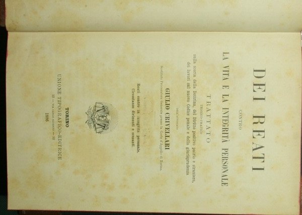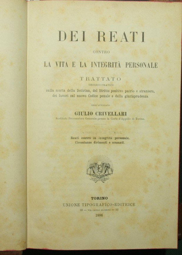 Reati contro la integrità personale. Circostanze dirimenti e scusanti - in 8° - pp.XVI + 928 - Mezza pelle con titolo e fregi in oro al dorso nervato - Tagli rossi - Trattato teorico-pratico sulla scorta della Dottrina, del Diritto positivo patrio e straniero, dei lavori sul nuovo Codice penale e della giurisprudenza