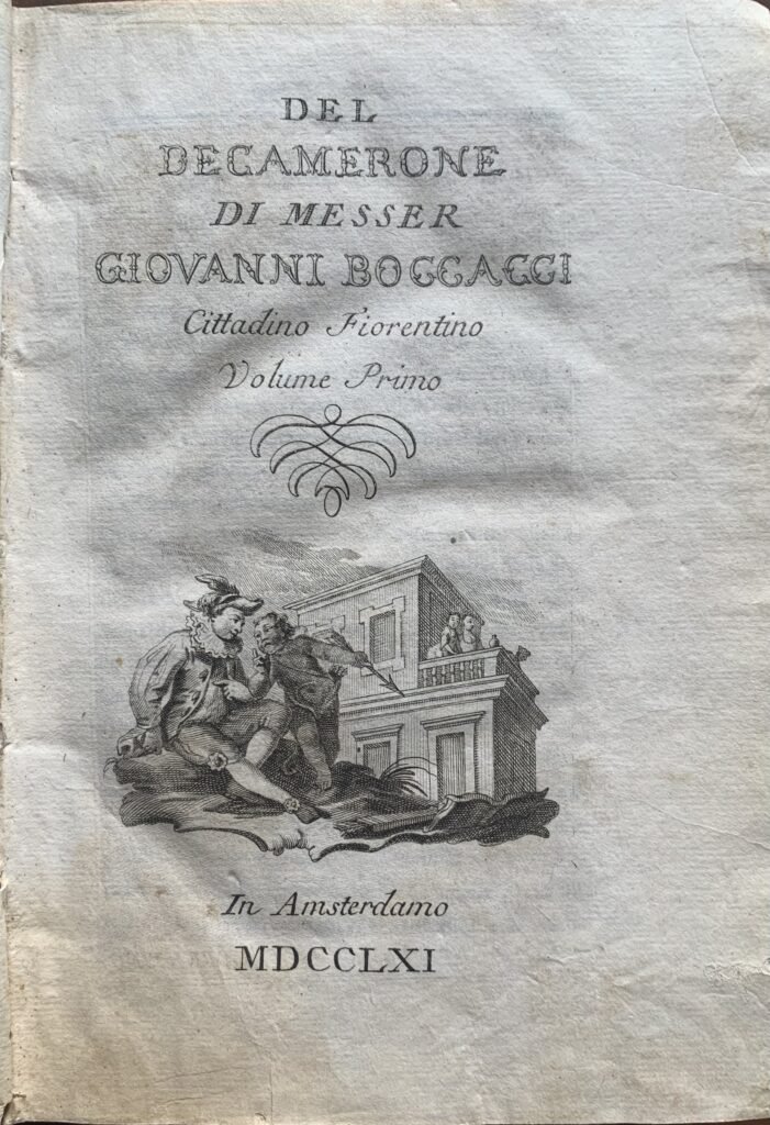 Giovanni Boccaccio. Del Decamerone. 2 volumi In Amsterdamo, 1761. Pelle. Pagine 1105 complessive. Dimensioni cm. 14 x 19,5.