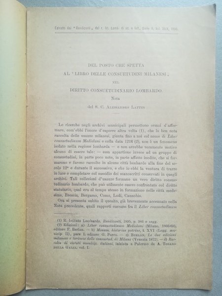 In 8 (cm 15 x 23,5), pp. 7 + (1b). Omaggio autografo al piatto anteriore. Brossura muta coeva. Estratto editoriale dai Rendiconti del R. Istituto lombardo di scienze e lettere. Articolo di Lattes sul diritto consuetudinario lombardo facente parte di una serie di saggi che poi confluiranno in uno studio piu' ampio, con raccolta di documenti inediti, che l'Autore pubblichera' nel 1899 presso Hoepli.