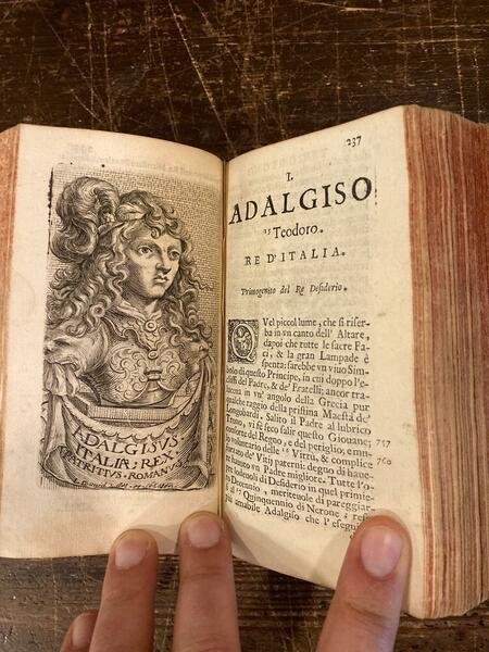 In-12° antico (166x92mm), pp. (21), 732, (72) di indici, legatura in mezza pelle marrone ottocentesca con titolo e fregi in oro al dorso, tagli spruzzati. 66 incisioni calcografiche f.t., opera di L. David, J. Ruphonus, Carlo Scotti, Antonio Bosio, Leonardus Henricus, etc., tra cui un'antiporta allegorica, 3 carte geografiche ripiegate, di cui la prima raffigurante la Scandinavia, la seconda la 'vera' Lombardia, l'ultima una delle prime carte topografiche del territorio canavesano, e un ritratto del Tesauro; le restanti tavv. raffigurano Re di popoli barbari o Re d'Italia dell'età delle invasioni barbariche. Vignetta calcografica al titolo con vascello e motto 'Ingenium superat vires'. Testatine e iniziali istoriate incise su legno. Antiche note cancellate sul frontespizio, qualche traccia d'uso, rifilato in testa, piccola mancanza integrata con tassello cartaceo al piede dell' ultima pagina ma buon esemplare nell'insieme. Ristampa veneziana di questa ricostruzione compiuta dal Tesauro delle dominazioni barbariche in Italia, certo il più organico sforzo operato nel Seicento di compilazione storica sull'Italia dei secoli bui', tra il declinare del IV secolo ed il crepuscolo dell'XI secolo. L'opera fu una delle principali fonti di Manzoni per i suoi studi sui Longobardi in Italia, culminati nella lirica trasfigurazione dell'Adelchi'. Cfr. (varie edizioni): Bruni Evans, 500. Cat. Vinciana, 499-501. Belloni, Il Seicento, pp. 449-450. Brunet, V, 730. Graesse, VI, p. 72. Olschki, Choix, 15778. S.T.C. XVIIth Century Italian Books, p. 901. Canavesio, Seicentina, 309. Picchetto, n. 141. Della Chiesa, Catalogo di tutti li scrittori piemontesi, Carmagnola, 1660, pp. 62-63. Manca al Manno.