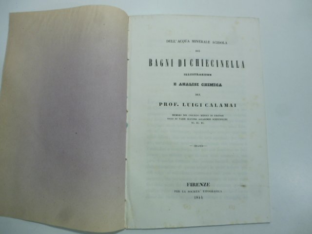 In 8 (cm 14,5 x 21), pp. 62 + (1) + (1b). Brossura muta coeva. Descrizione e analisi chimico idrologica delle acque di Chiecinella, presso Palaia, in Toscana.