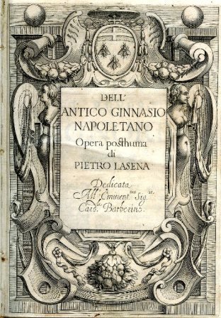 In-4° (230x165mm), pp. (6), 292, legatura di fine Ottocento in m. pergamena e angoli con dorso recante un tassello in pelle con titolo in oro, fiorellini policromi e filetti in oro e in nero. Frontespizio inciso. Testatine, finalini e iniziali istoriate. Qualche lieve brunitura. Ottimo esemplare. Rara edizione originale (il Graesse cita una fantomatica edizione del 1638, ma si tratta di una sua svista, in quanto di essa non esiste traccia da nessuna altra parte), pubblicata a Roma senza indicazioni tipografiche (la data è evincibile dalla sola dedicatoria). Lo studio riguarda il Ginnasio di Napoli in età romana, ed è ricco di notazioni sulla sua importanza socio-politica, sugli spettacoli in esso celebrati, tra cui i Giochi Capitolini, sull'archeologia del suo edificio, etc. 'Opera di gran conto presso gli eruditi. Dopo aver parlato diffusamente di tutti i giuochi e spettacoli che si rappresentano a Napoli tanto ne' tempi precedenti ad Augusto, che ne' posteriori. dimostra che tutti i Ginnasi dell'Ellenistico mondo, e per conseguenza che quello di Napoli, fossero stati assolutamente fondati per gli esercizi corporali e non già per quelli dello spirito.' (Giustiniani). Il Lasena (Napoli, 1590-Roma, 1636) fu celebre giurista, erudito e filologo. Vinciana, 4476: 'Interessante trattato archeologico'. Graesse, IV, p. 113. Lozzi, 3036 (ristampa del 1688). Santoro, 1521. Giustiniani, p. 73.