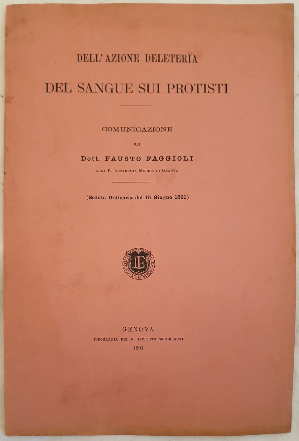 Interessante pubblicazione del 1891 sull'azione deleteria del sangue sui protisti di Fausto Faggioli. Seduta ordinaria del 15 giugno 1891. In buone condizioni. Copertina editoriale in buone condizioni generali con lievi usure ai margini e dorso. Legatura in buone condizioni. Pagine in ottime condizioni con rare fioriture. In 8. Dim. 25x16,5 cm. Pp. VI+562. Kg. 0,033 Interesting pamphlet of 1891 about the bad action of blood on protists by Fausto Faggioli. Ordinary chair of the 15th of june 1891. In good conditions. Editorial cover in good general conditions lightly worn in the extremities. Binding in good conditions. Pages are in very good conditions with occasional foxing. In 8. Dim. 25x16,5 cm. Pp. VI+562. Kg. 0,033