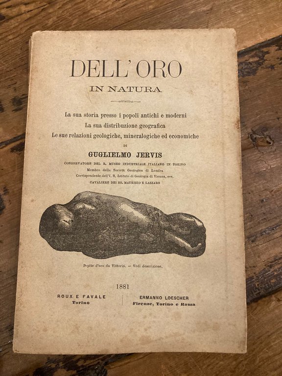 In-16° (19x13 cm), pp. XVI, 204 (4), brossura editoriale figurata b/n (pepita d'oro da Vittoria, ripetuta al frontespizio). Controfrontespizio inciso raffigurante una miniera aurifera californiana, alcuni disegni nel testo anche a piena pagina; al contropiatto posteriore grande tavola ripiegata con prospetti grafici e statistici. Ottimo esemplare. Non comune edizione originale di uno dei lavori ottocenteschi di riferimento sul nobile metallo. William Paget Jervis, detto Guglielmo (1832-1906), è stato un geologo e ingegnere inglese naturalizzato italiano. Nato nei pressi di Bombay da genitori inglesi, si trasferì presto a Londra ove nel 1853 si laureò in ingegneria, per poi spostarsi a Edimburgo laddove perfezionò i suoi studi. Nel 1862 giunse in Italia stabilendosi nell'allora capitale Torino, ove trascorse buona parte della sua vita svolgendo il ruolo di direttore del Regio museo industriale. Jervis un periodo di intense ricerche, viaggi esplorativi, raccolta di materiali attraverso tutta la penisola. Durante questo periodo di intensa attivita', entro' in contatto con i principali esponenti della geologia italiana, in particolare con Arturo Issel (1842-1922) dell?Universita' di Genova. Nell'anno della sua morte il museo da lui diretto si fuse con la Regia Scuola di applicazione per gli ingegneri per dar così vita al Politecnico di Torino.