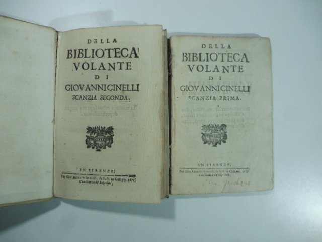 2 volumi in 16, cm 11 x 16,5, pp. 96; 112. Legature difformi in cartonatura coeva e piena pergamena. Primi due volumetti di questa bibliografia dedicata a opuscoli e placchette di scarsa mole e dimensioni e che, proprio per questa loro natura, erano a rischio di andare persi. Questi vennero pubblicati a partire dal 1677 sino alla sua morte e in seguito continuati da altri sempre sotto il nome di Biblioteca volante, arrivando cosi' alla scanzia XXXIIIo nel 1739. Il Cinelli peraltro, oltre che letterato e bibliografo fu anche medico, dotato di un carattere particolarmente irascibile, fu coinvolto in molte dispute di carattere letterario e professionale fino ad essere accoltellato in occasione di una rissa in Sansepolcro. . Brunet (II, 70): 'Ces notices d'opuscoles de tous genres forment un recueil inte'ressant pour les bibliographes'. Gamba (1880): 'oggidi' assai rare'.