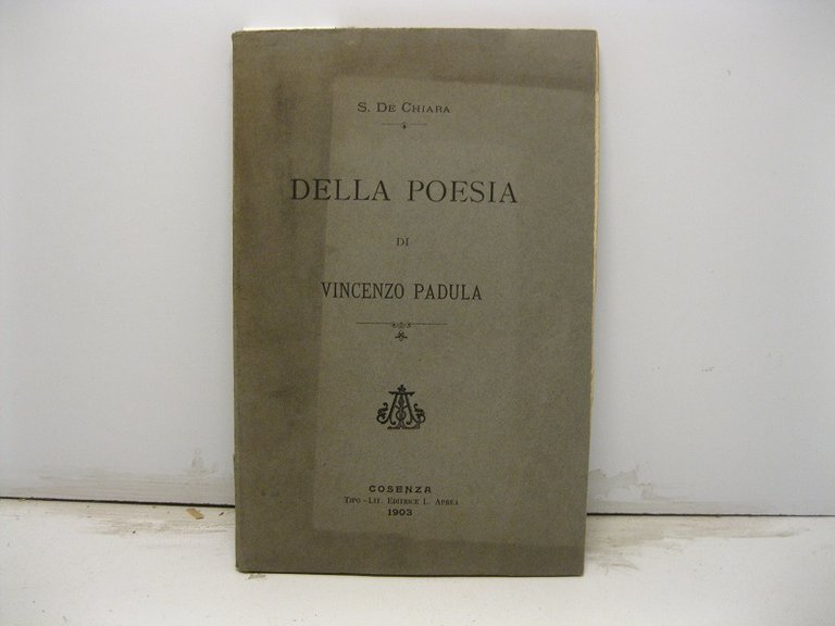 In 16, pp. 118 + (2). Intonso. Br. ed. Saggio critico relativo alla poesia di Vincenzo Padula (Acri, 1819 - ivi, 1893), poeta e patriota.
