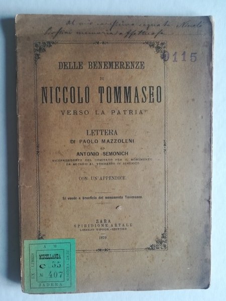 In 8 (cm 15 x 21), pp. 68. Dorso rifatto. Omaggio manoscritto al piatto anteriore. Brossura editoriale. Lettera di Paolo Mazzoleni ad Antonio Semonich vicepresidente del Comitato per il monumento da alzarsi al Tommaseo in Sebenico. Saggio in cui l'A. descrive gli sforzi fatti da Tommaseo per aiutare la popolazione della Dalmazia nella terribile carestia del 1846 e 1847 con pubblicazione delle lettere sull'argomento al podesta' di Sebenico Vncenzo Sisgoreo.