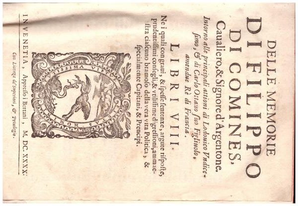 Delle memorie di Filippo di Commines, Cavaliero & Signore d'Argentone. Intorno alle principali attioni di Lodovico Undicesimo & di Carlo Ottavo suo Figliuolo amendue Rè di Francia.