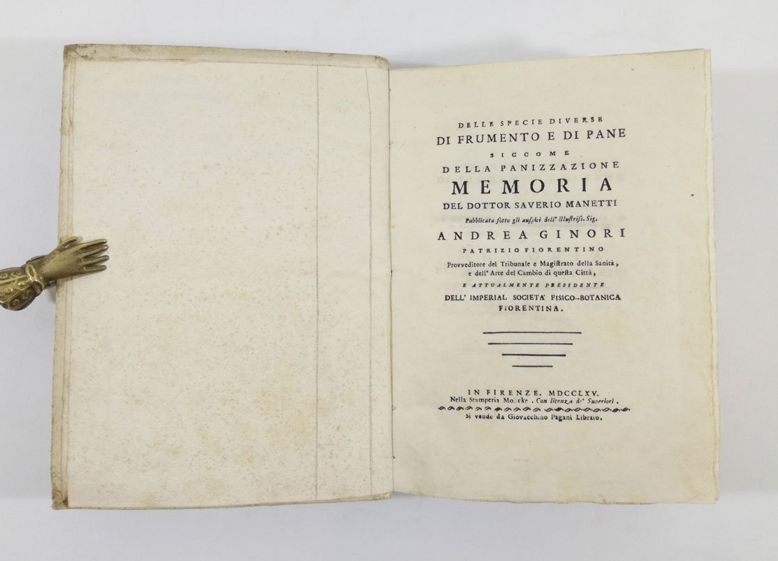 Delle specie diverse di frumento e di pane siccome della panizzazione. Memoria del dottor Saverio Manetti pubblicata sotto gli auspici dell’Illustris. Sig. Andrea Ginori [.]
